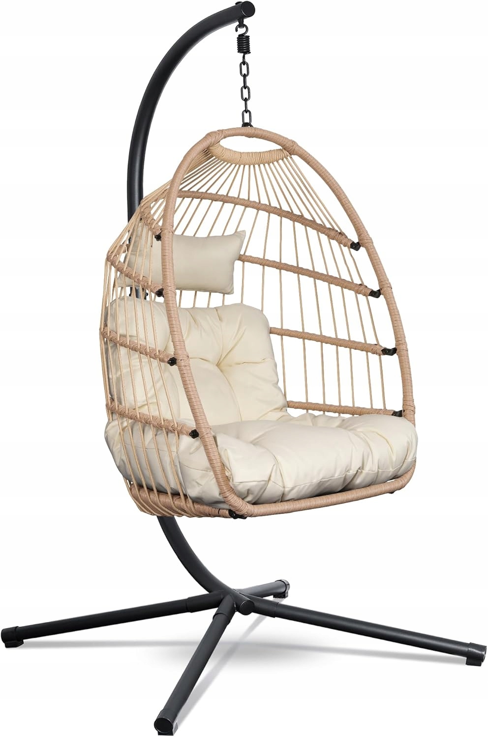 Fotel wiszący kokon ogrodowy z poduszką – czarny stelaż + kremowa poduszka | Max 150 kg | Styl & relaks w jednym